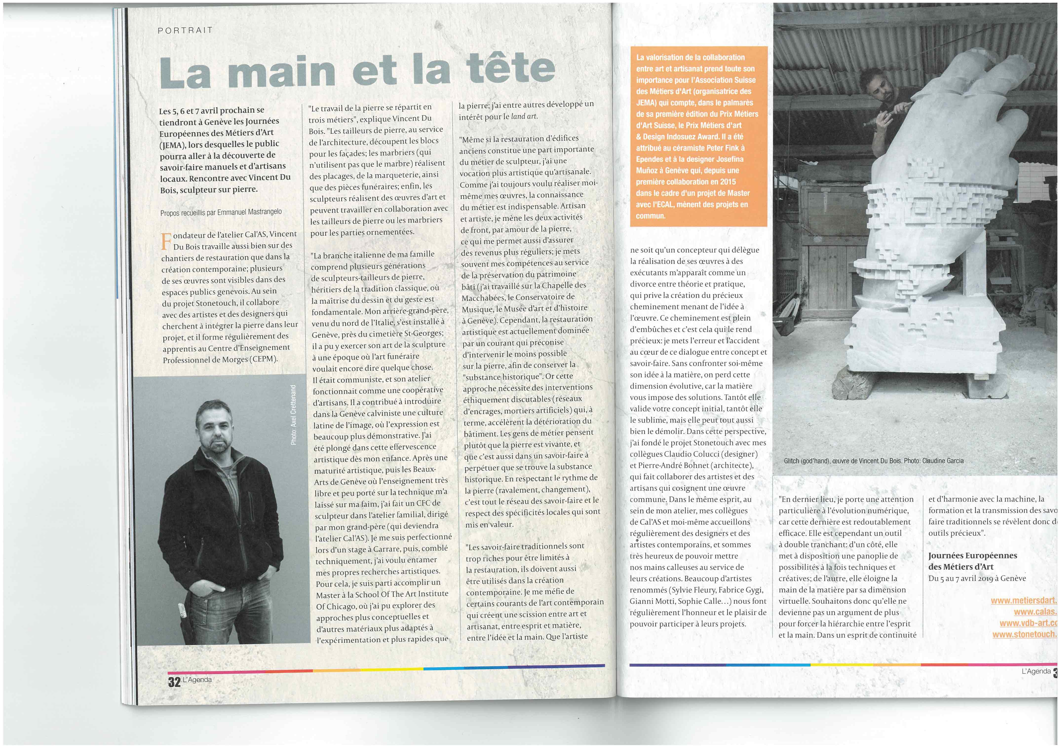 A l’occasion des Journées Européennes des Métiers d’art, l’Agenda, revue culturelle de l’arc lémanique, publie un article sur Vincent Du Bois, sculpteur sur pierre et membre de l’association Label Genève.