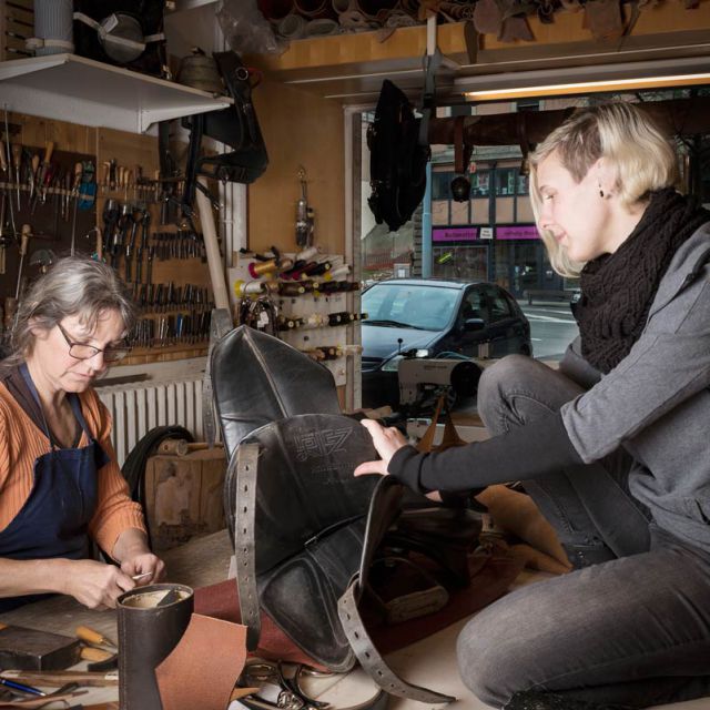 Dès l’entrée, l’atelier sent bon le cuir. Les outils ne font pas de bruit et il y règne un calme et une douceur qui annonce un vrai savoir-faire. Le cuir est sur l’établi, Fabienne (sellière depuis 1984) travaille sur un harnais à réparer, un jeune cheval en a cassé une pièce. L’apprentie recoud un licol. Un sac à dos attend son tour pour être copié, il est bien trop vieux mais son propriétaire aime ce modèle. Une selle patiente également pour être rembourrée, Fabienne est déjà passée au manège prendre les mesures du cheval à qui elle devra aller comme un gant. Une valise compte sur le changement d’une fermeture éclair pour repartir en voyage. Une épée pourra bientôt se ranger dans un magnifique fourreau.